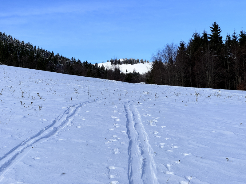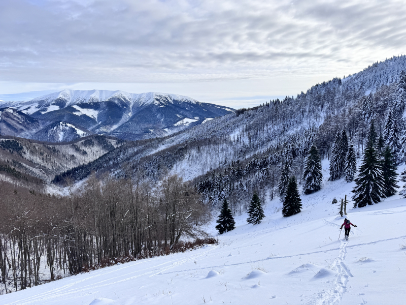 V počte 3 (Ičovi sa nedalo) sme zaparkovali Káru. Obuli sme lyže a že skúsime Céčkom ísť nahor. Slniečko začalo svietiť, modrá obloha, podmienky výborné aj v lese (o čom sme v uplynulej sezóne mohli len snívať) a začalo to veľmi rýchlo chutiť. Na Patočinách otče usúdil, že skúsime Žarnovku. Prekrásna. Zasnežená i keď poriadne zarastená (oťažené stromy vytvárali miestami tunel na prechod). Stúpanie na Solisko bolo technicky náročnejšie, no otče nám spravil stopu. Natrénovali sme otočky. A snehu som už tu mala v lyžiarkach dostatok (to tie legíny). Samozrejme na hrebeni, kochajúc sa nádherou, prišlo „pozvanie“ na obkuknutie doliny Hričkovského potoka.
