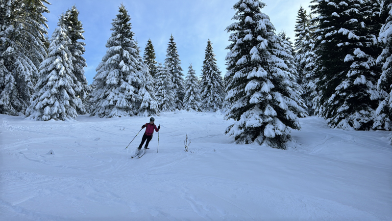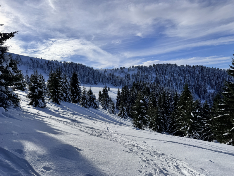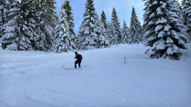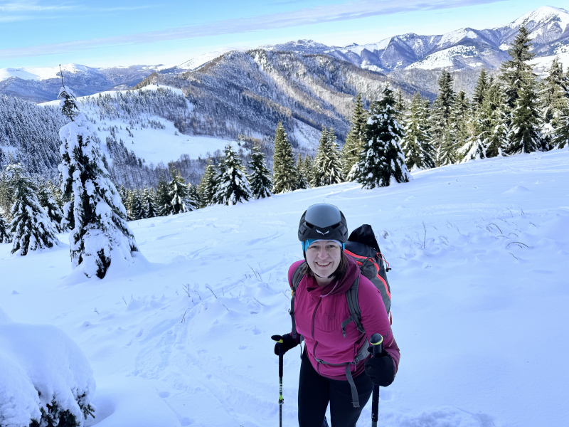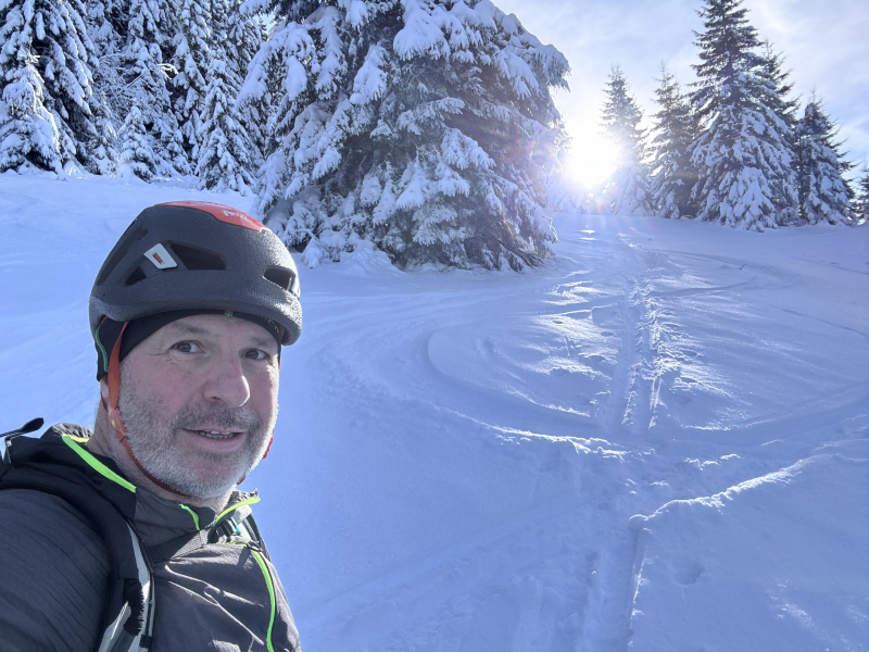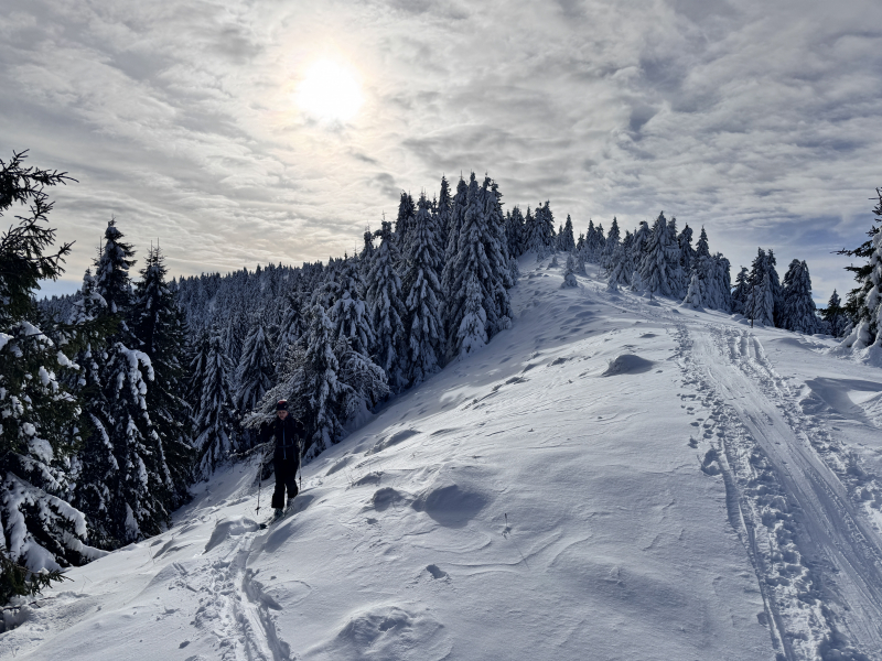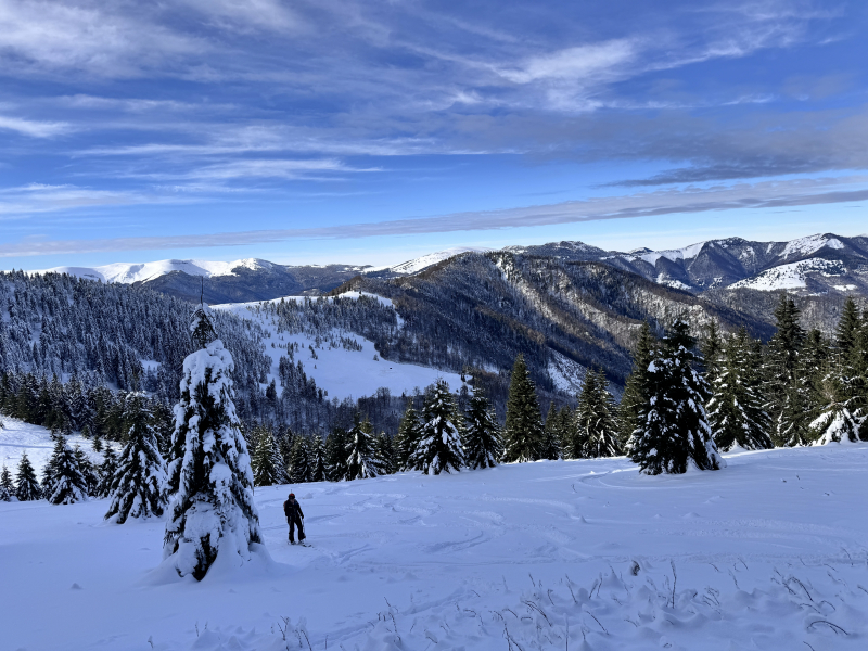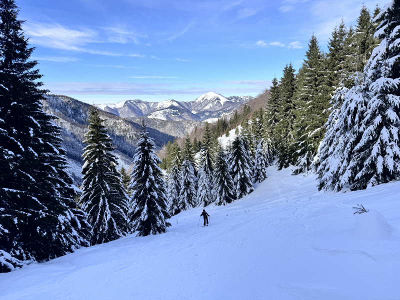 A následne nás pozvala dolinka, nedalo sa jej odolať. Dva zjazdy v prašane typu „liberta pura“ alebo „amerika“. Nečakaná nádhera na každom kroku – lyžovanie, stromy, slnko, ticho, prašan, výhľady, pokoj a sneh v lyžiarkach 😉